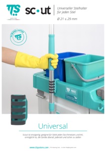 www.ttsystem.com | TTS Cleaning S.R.L. - E-mail: info@ttsystem.com PATENTED SYSTEM Ø 21 ≤ 29 mm Universeller Stielhalter für jeden Stiel Universal Scout ist einzigartig: geeignet für Stiele jeden Durchmessers und Art, ermöglicht es, die Geräte überall, jederzeit und sicher zu stellen