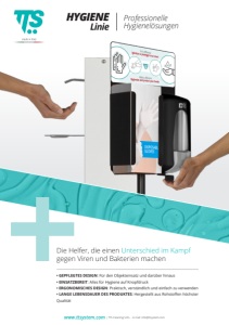 www.ttsystem.com | TTS Cleaning S.R.L. - E-mail: info@ttsystem.com Professionelle Hygienelösungen HYGIENE Linie Die Helfer, die einen Unterschied im Kampf gegen Viren und Bakterien machen • GEPFLEGTES DESIGN: Für den Objekteinsatz und darüber hinaus • EINSATZBEREIT: Alles für Hygiene auf Knopfdruck • ERGONOMISCHES DESIGN: Praktisch, verständlich und einfach zu verwenden • LANGE LEBENSDAUER DES PRODUKTES: Hergestellt aus Rohstoffen höchster Qualität