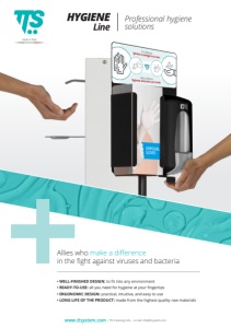www.ttsystem.com | TTS Cleaning S.R.L. - E-mail: info@ttsystem.com Professional hygiene solutions HYGIENE Line Allies who make a difference in the fight against viruses and bacteria • WELL-FINISHED DESIGN: to fit into any environment • READY-TO-USE: all you need for hygiene at your fingertips • ERGONOMIC DESIGN: practical, intuitive, and easy to use • LONG LIFE OF THE PRODUCT: made from the highest quality raw materials